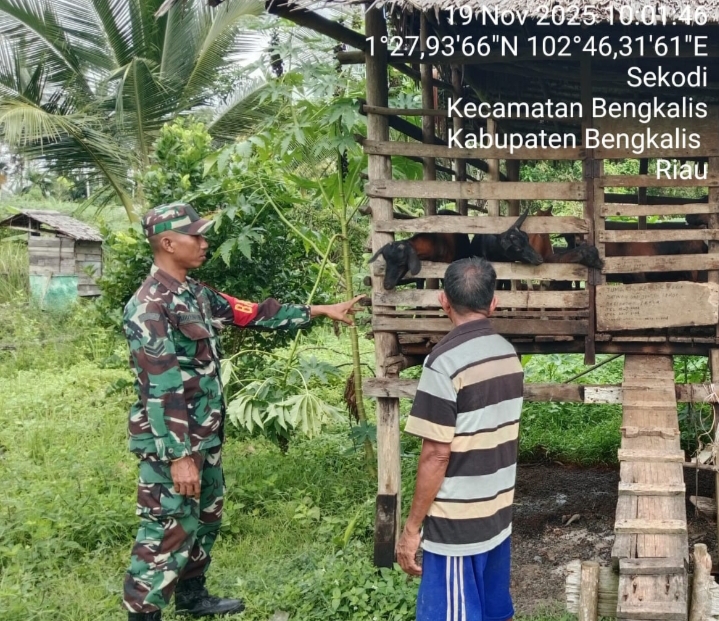 Suarapesisirnusantara.com |Bengkalis -Babinsa Koramil 01 Sertu Muzainudin melaksanakan pengecekan hewan ternak dalam rangka mencegah penyakit PMK pada hewan ternak yang bertempat Di Desa Sekodi Kecamatan Bengkalis Kabupaten Bengkalis, Rabu 19 November 2025 Pukul 09.47 Wib.