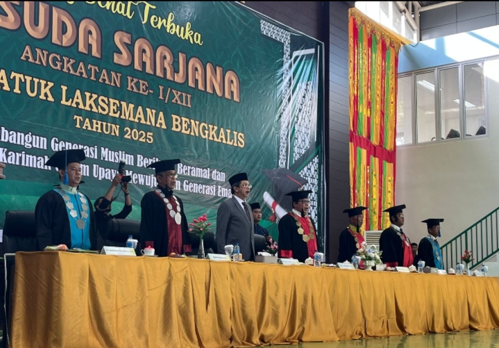 Bupati Bengkalis Diwakili Staf Ahli Bupati Bidang Ekonomi, Pembangunan dan Keuangan Syahrudin SH.MM dalam sambutannya menyampaikan atas nama pemerintah kabupaten bengkalis menyampaikan ucapan selamat dan sukses kepada 572 wisudawan dan wisudawati institut agama islam negeri datuk laksamana bengkalis angkatan i/xii tahun 2025, yang hari ini resmi menyandang gelar sarjana.