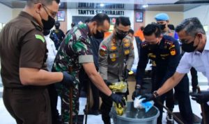 Kemudian Kapolres Bengkalis bersama Dandim 0303, Kejari Bengkalis, serta Bupati Bengkalis diwakili, melakukan pemusnahan barang bukti tersebut yang disaksikan undangan dan insan pers, sekaligus Penandatanganan berita acara pemusnahan.
